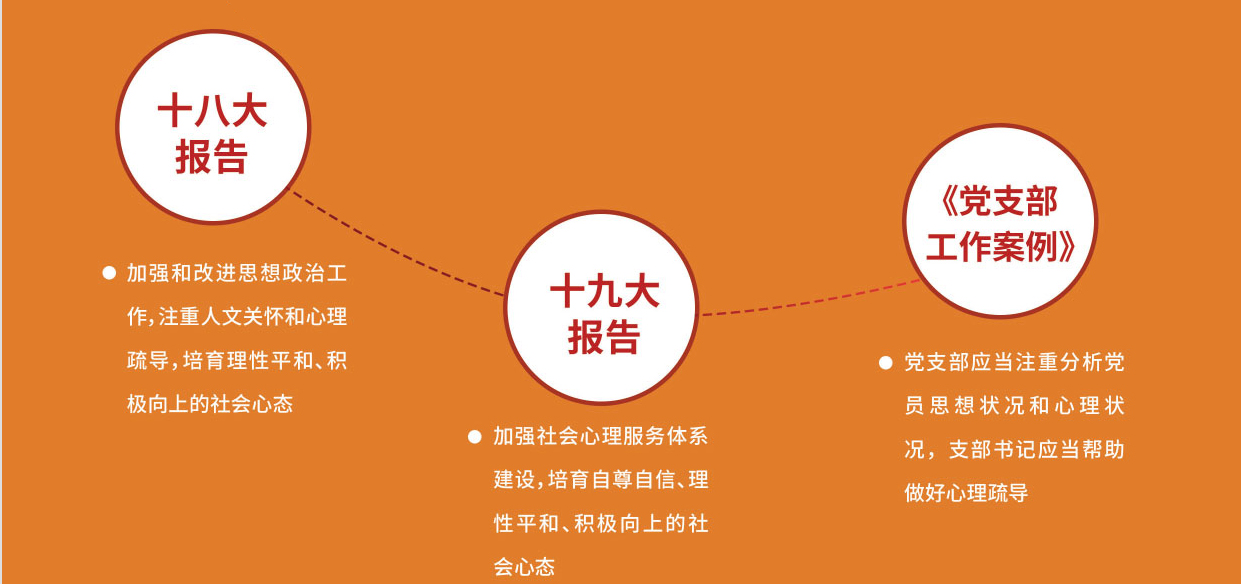 党的十八大报告指出 党的十八大报告指出:“加强和改进思想政治工作,注重人文关怀和心理疏导,培育理 性平和,积极向上的社会心态”。《中国共产党支部工作条例》明确要求党支部应当注重分 析党员思想状态和心理状态,条例中还指出“对身心健康存在突出问题的党员,要求党支 部书记做好心理疏导”等内容。盛心技术党建创新“心之力”将心理学的技术和方法运用于思想建设工作中。诸如谈心谈话、调查研究、批评与自我批评,以及组织生活和党日主题活动中。深笃党的创新理论,赓续红色精神血脉,盛心“心之力”旨在帮助各级组织培养教练 型、赋能型的党员干部,以坚定信仰担当使命、以过硬本领担当使命、以优良作风担当使 命,从而完成从情感建设到思想建设再到组织建设的历程。
